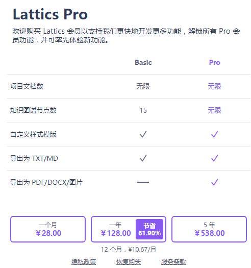- 最后说下付费项,如下图,个人觉得免费的就够用了,如果要导出PDF/DOCX/图片,则需要付费