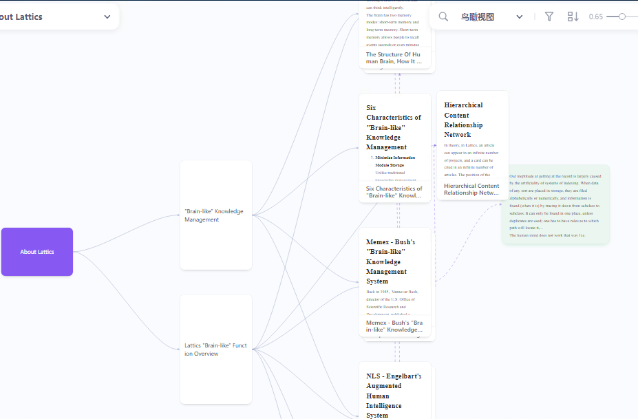 - 强大的图谱功能,类Ob的canva,但更人性化,有3种模式,我一般使用鸟瞰模式,显示的信息最多,如果能导出为图片那就更好了。
