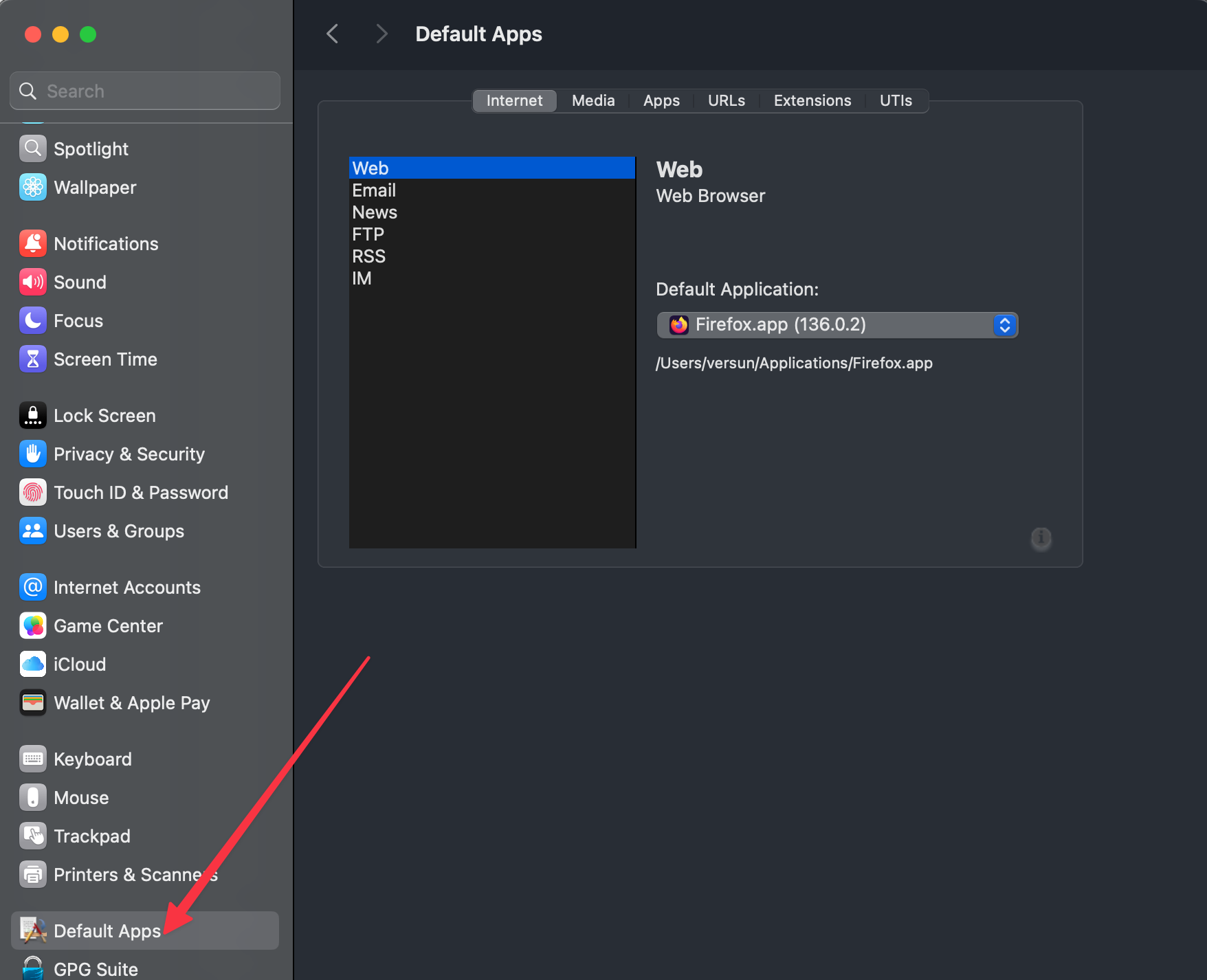 5. 关闭系统设置,重新打开系统设置,在最下方就有一个 Default Apps 设置项,非常方便