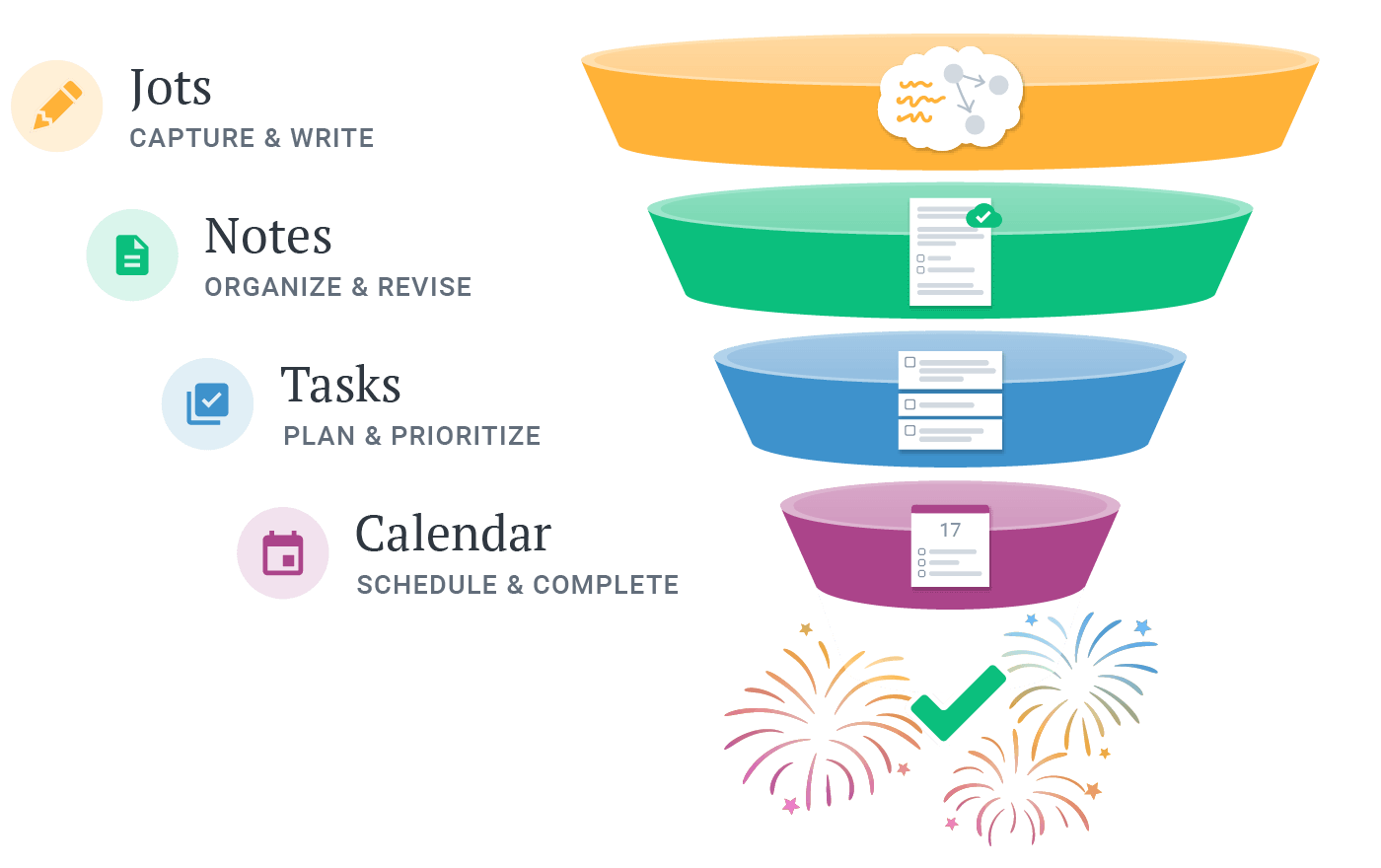 按照之前的官方流程图,Jots的作用是capture,Notes是整理,Task是计划优先级,Calendar是安排完成
